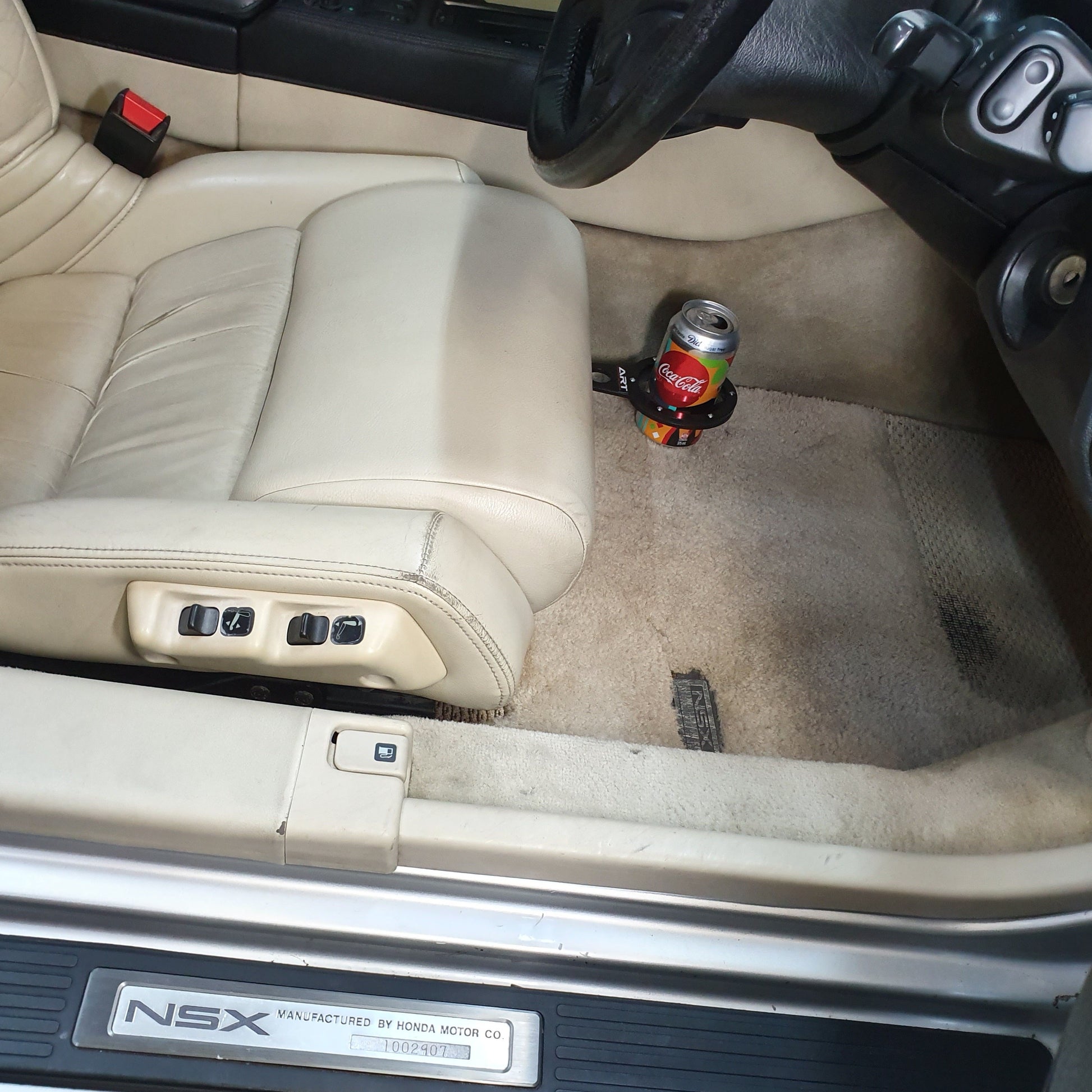 AutoRacingTechnik adjustable cup holder comes complete with mounting kit to attach directly to your NSX factory seat rail motor mount points, no drilling or cutting required. Seat rail motor mounting bracket may require very slight adjustment due to varying changes in the year of manufacture and seat design. This cup holder is NOT suitable for use on NSX TYPE R models with manual seat adjustment or NSX vehicles fitted with aftermarket or non-standard manual seats