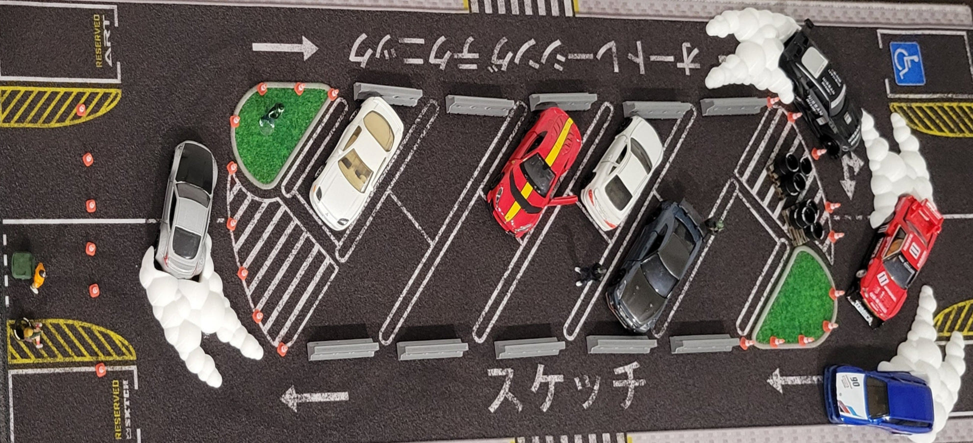 Each kit is designed to be used on a single 1:64 model car and contains a smoke cloud (choice of LEFT or Right drift direction), 2 medium road barriers (one red and one white), and 6 safety cones. Smoke clouds are made of soft semi-flexible polymer. Road barriers and safety cones are made of ridged PLA plastic.